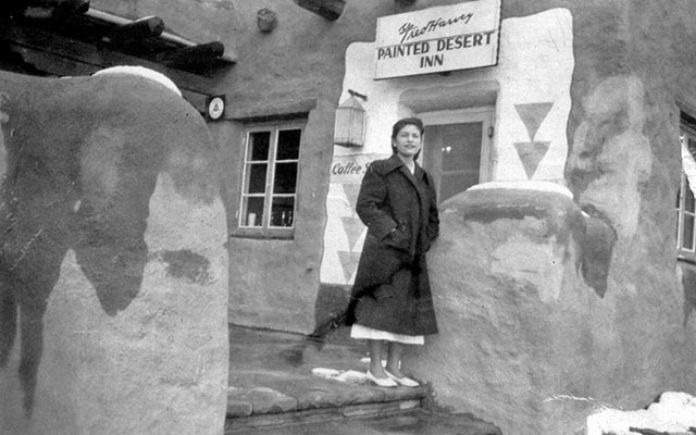 In 1946, Fred Harvey Company began operating the Painted Desert Inn. There was a lunch counter and a restaurant and a gift shop for Route 66 travelers, with a stunning view into the Painted Desert. The Inn was only ten years or so into its life as a pueblo-style building serving National Monument visitors. It was intended to be an attraction to get Route 66 travelers off the road and directed south to see the petrified wood at Jasper, Crystal, and Rainbow forests, and the museum 25 miles away.